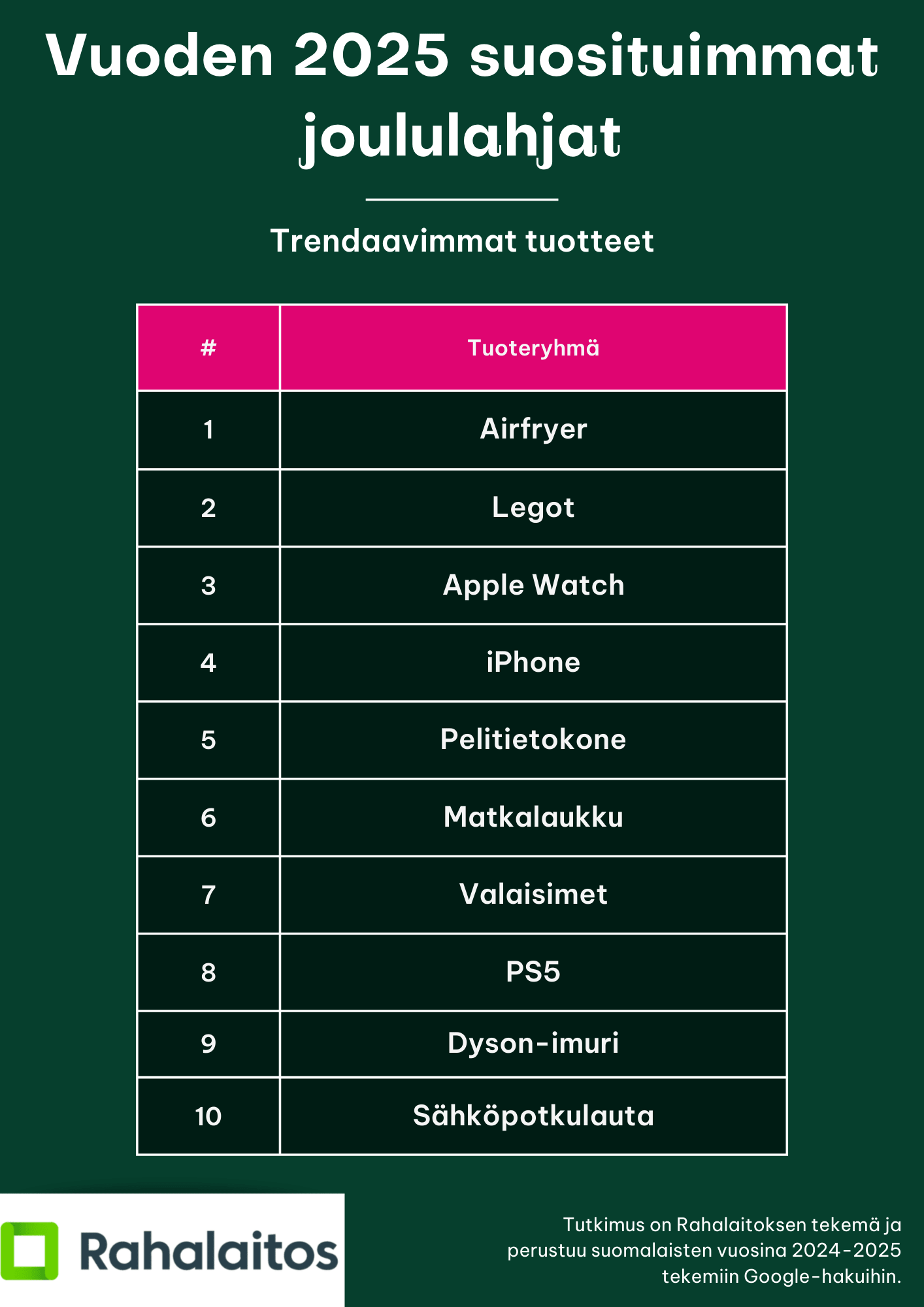 Tutkimus perustui Ahrefsin hakudataan, jonka avulla tarkastelimme Suomessa tehtyjä Google-hakuja viimeisen 12 kuukauden ajalta. Vertailimme tuotteiden hakumääriä sekä hakujen kasvuprosentteja, jotta saimme kokonaiskuvan siitä, mitkä tuotteet ovat herättäneet eniten kiinnostusta ja mitkä ovat nousseet uusiksi trendeiksi. Hakuvolyymien ja kasvuprosenttien yhdistäminen tarjosi tavan tunnistaa sekä pitkän aikavälin suosikkeja että nopeammin nousevia ilmiöitä.