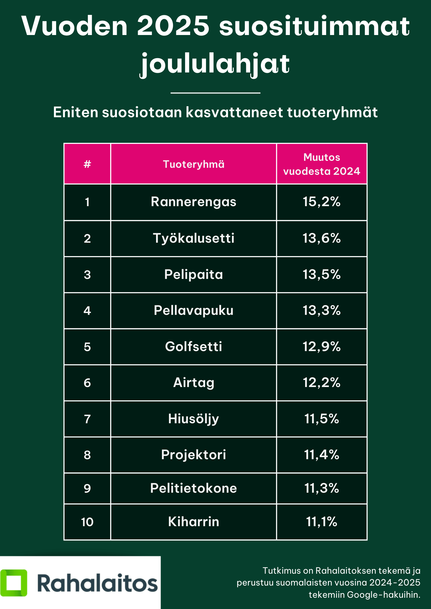 Rahalaitos tarkastelee hakudataa auttaakseen suomalaisia hahmottamaan kulutustrendejä ja ilmiöitä talouden näkökulmasta. Tavoitteena on tarjota selkeää ja faktapohjaista tietoa, ei kannustaa tiettyjen tuotteiden hankintaan, vaan tuoda esiin, millaiset kategoriat ja tuotteet ovat herättäneet kiinnostusta kuluneen vuoden aikana.